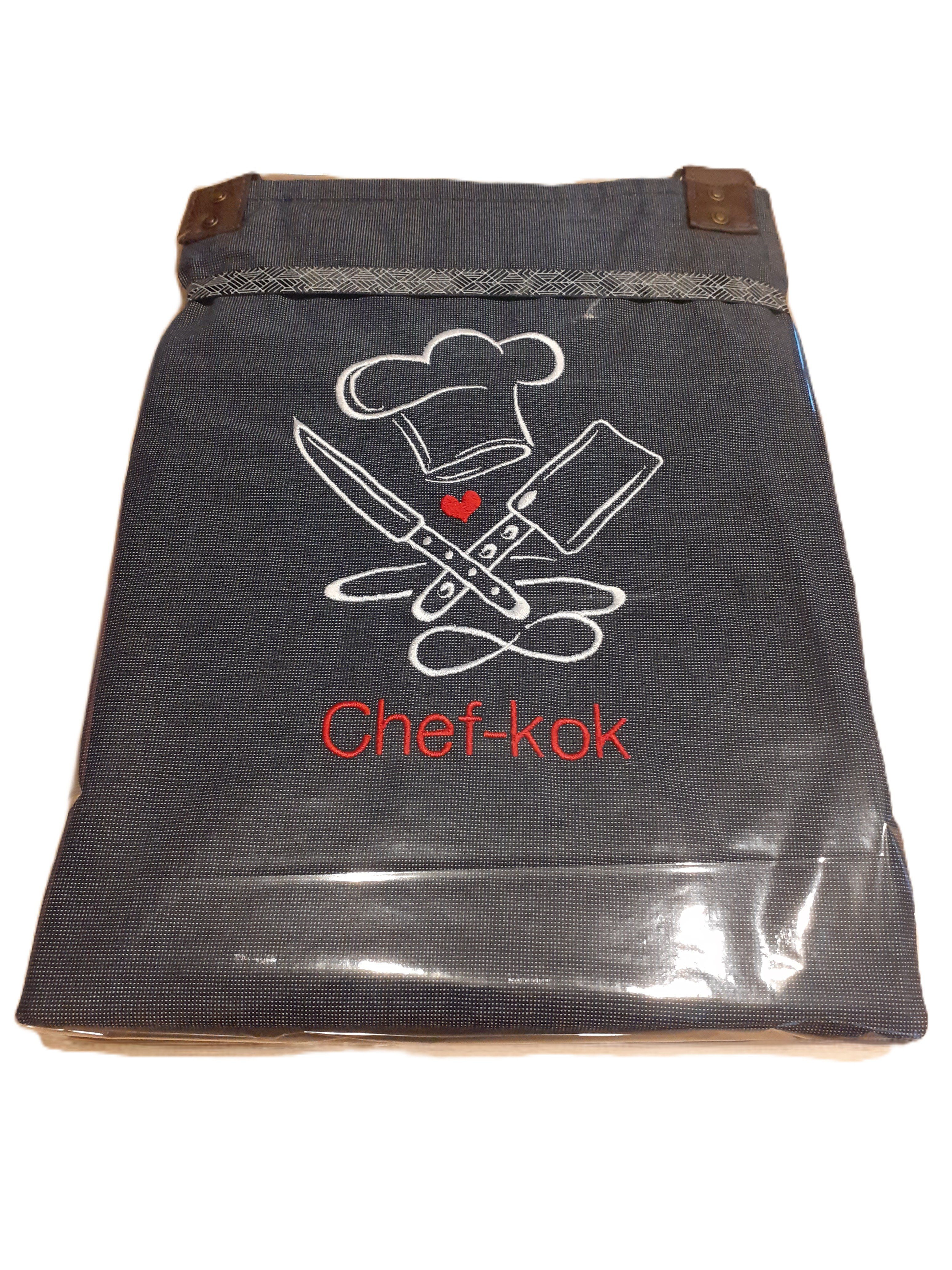 - Naam of tekst wordt geborduurd bovenaan in het midden van de bistro schort