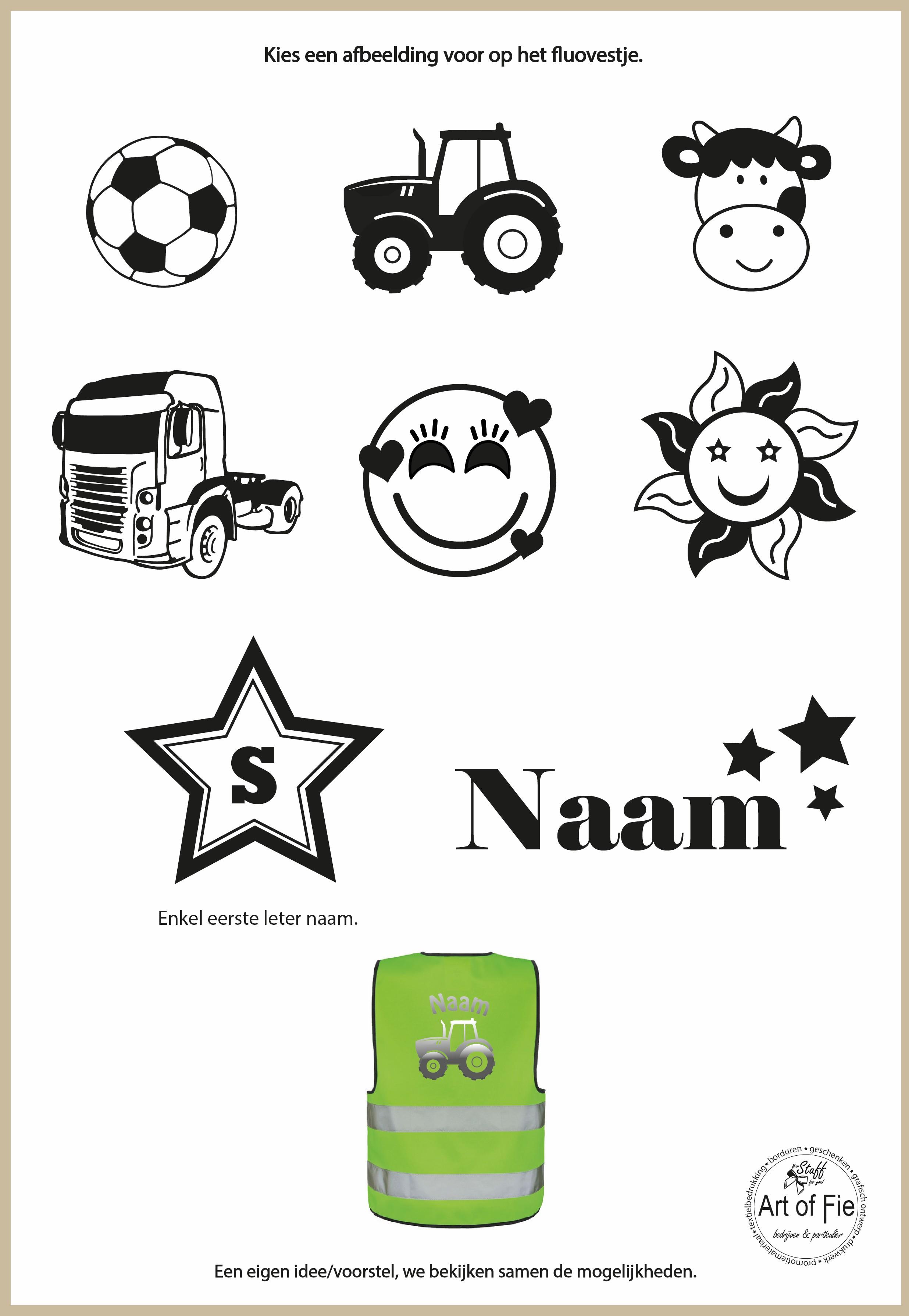 Maak aan de hand van de laatste foto keuze uit de mogelijke afbeeldingen en vermeld deze bij je bestelling. Vergeet zeker niet de NAAM die gedrukt moet worden en de MAAT en KLEUR keuze van het fluovestje zelf te noteren bij het plaatsen van uw bestelling.
