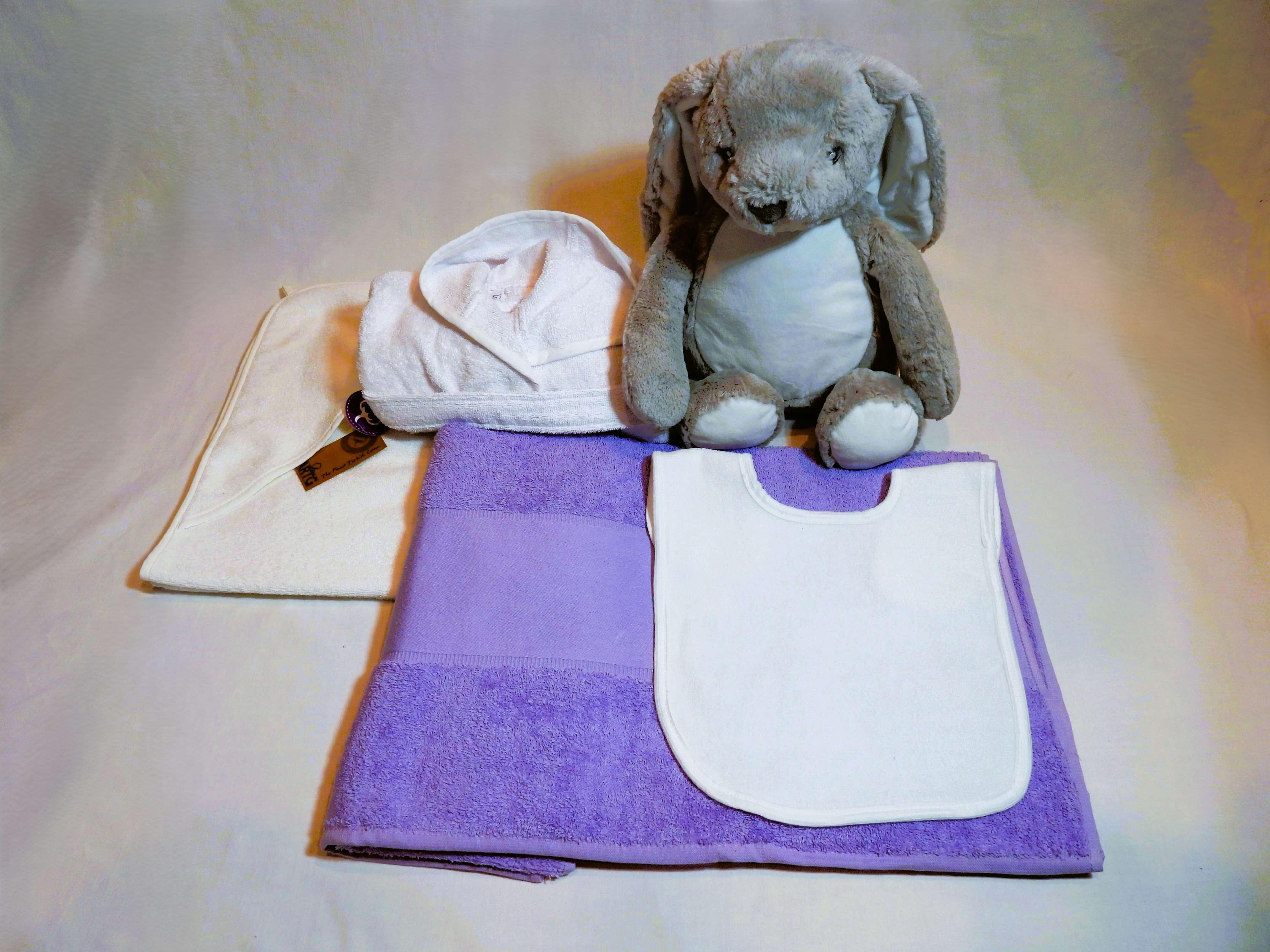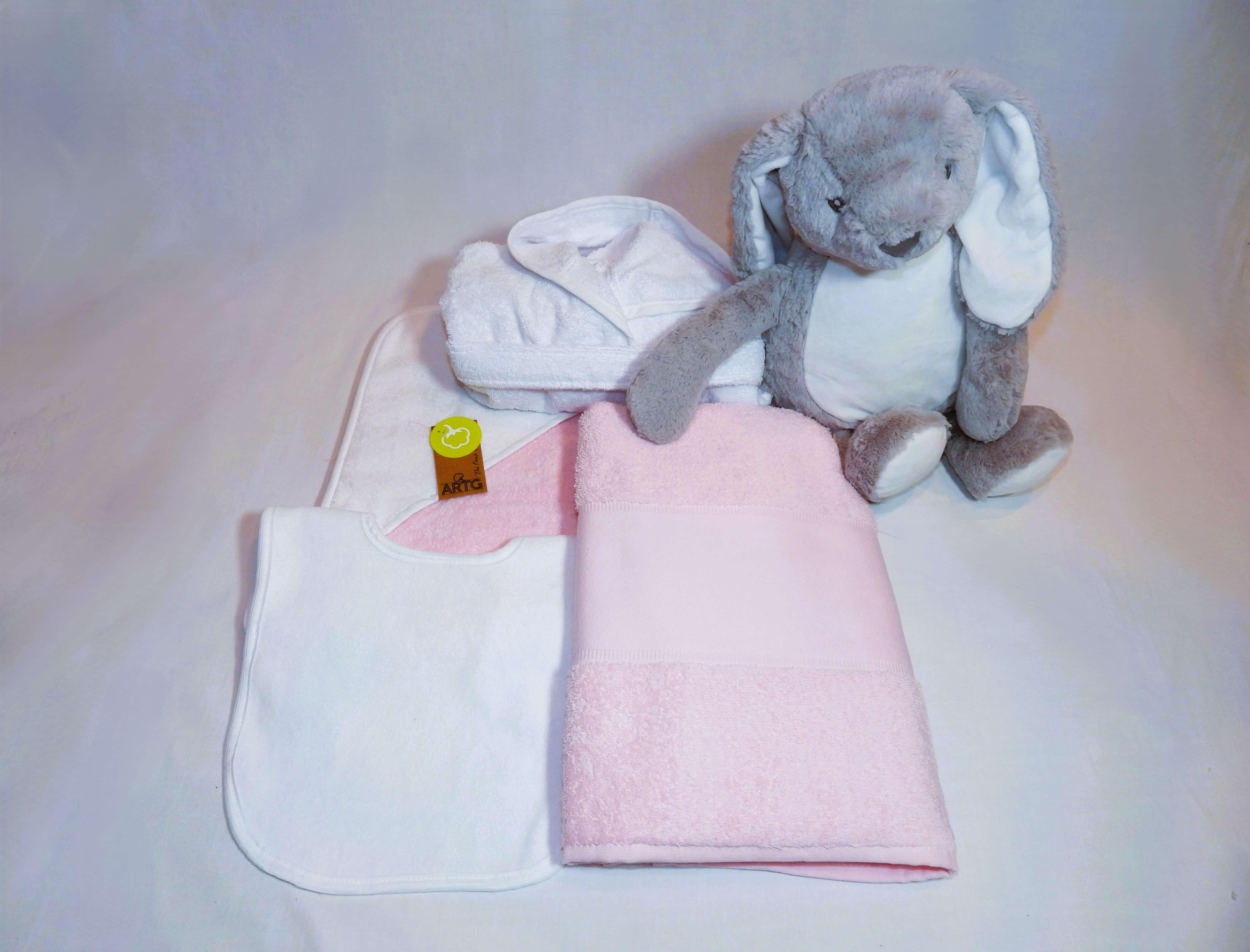 - 1 badhanddoek met kap met kleur naar keuze: Licht Roze/Wit, Licht Blauw/Wit, Donker Blauw, Wit