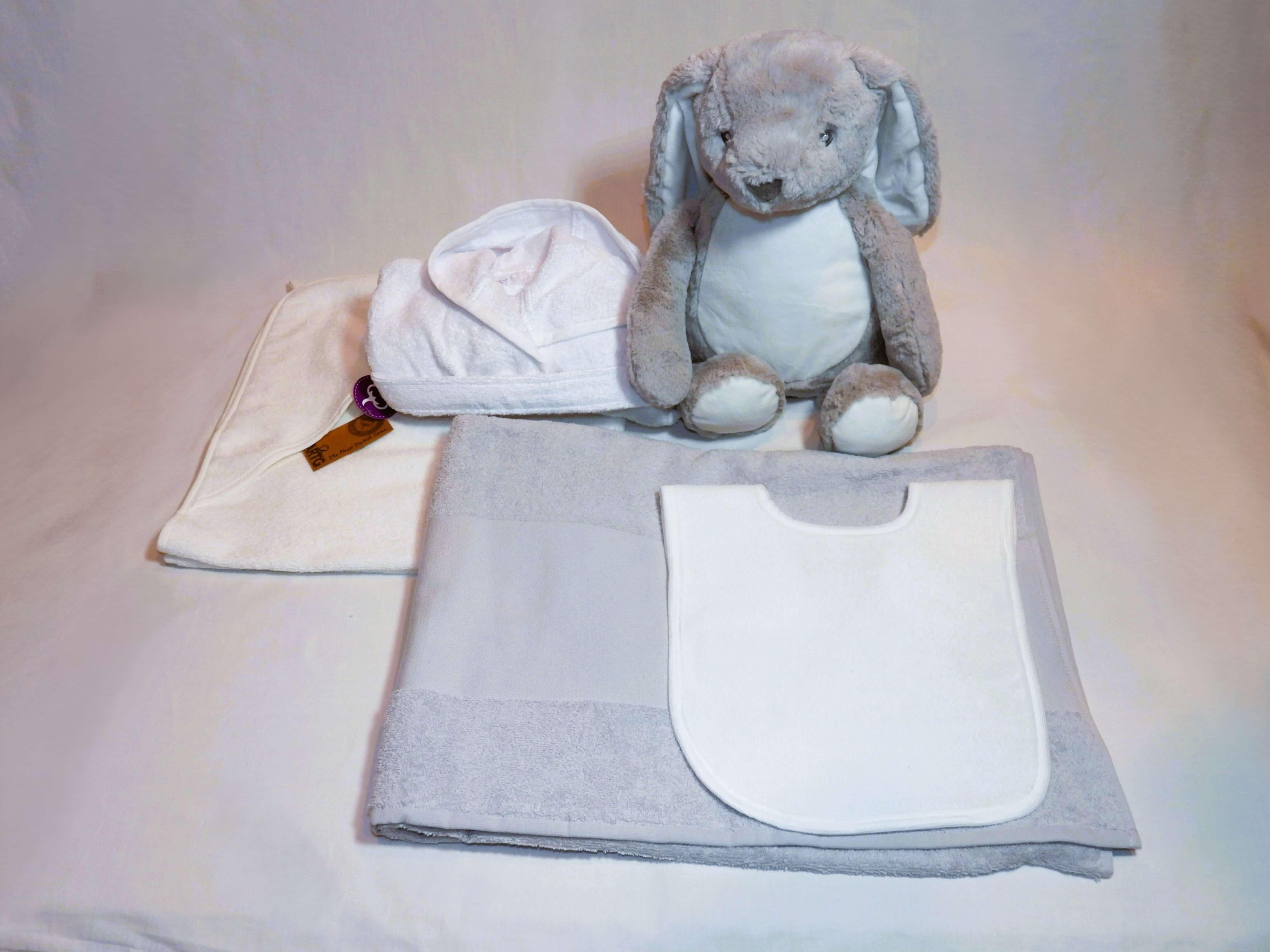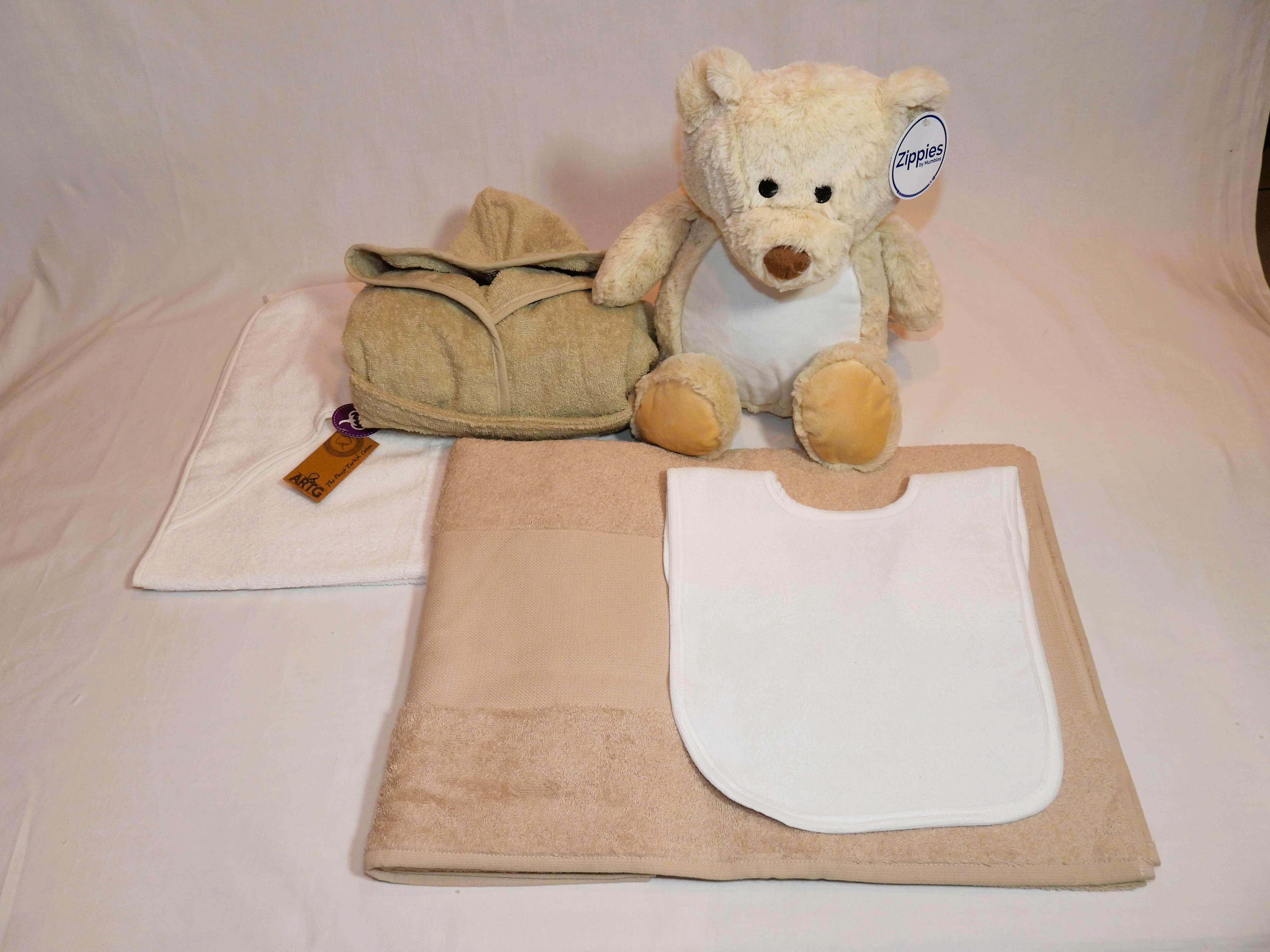 Naam wordt geborduurd in het midden op de slab, op de voorkant rechterzijde badjas, in het midden op de buik van het knuffeldier, op voorkant kap van de handdoek met kap, in het midden op de band van de badhanddoek