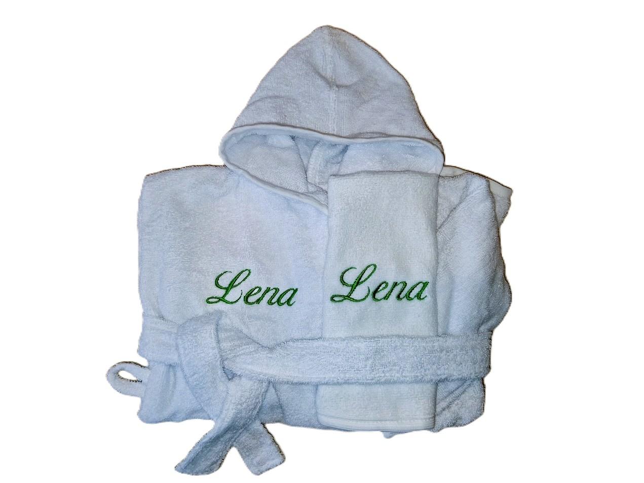 Naam wordt geborduurd in het midden op de slab en op de voorkant rechterzijde badjas